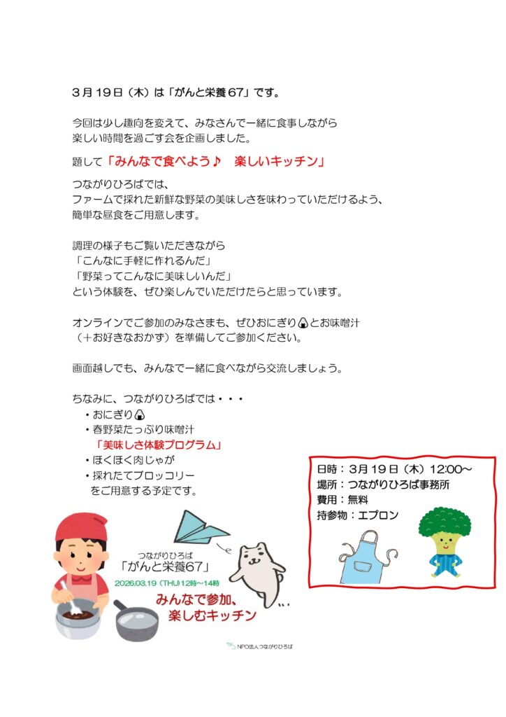 2026年3月12日 / 最終更新日 : 2026年3月12日 笹田 屋外イベント 3月19日「がんと栄養67」お知らせ! 今年度最後の「がんと栄養67」です。 今回はちらしにあるように、つながりひろばで簡単調理にチャレンジします。 詳細は下記のちらしをご確認ください。 〇参加希望の方はつながりひろばHPよりお申し込みください HP:https://tsunagari.osaka.jp/ 〇募集人数: リアル(事務所)での参加:10人 オンライン:人数制限はありません 参加URL: https://us02web.zoom.us/j/8200358780?pwd=eGlYWHhRck1rOUJqVTVpaFRzVE5WZz09&omn=84528345842 ミーティング ID: 820 035 8780 パスコード:お申し込み後に連絡します 参加お申し込みは下記より お名前 (必須) メールアドレス (必須) 電話番号(必須) 参加人数1人2人3人4人5人 イベントの参加方法をお選びください。 リアル(定員10名まで)オンライン ※イベント当日の写真を、つながりひろばホームページなどSNSで掲載する事をご承諾いただけますか? はい、撮影は大丈夫です。いいえ、撮影はなしでお願いします。 メッセージ・ご質問があればお書きください。 Follow me!