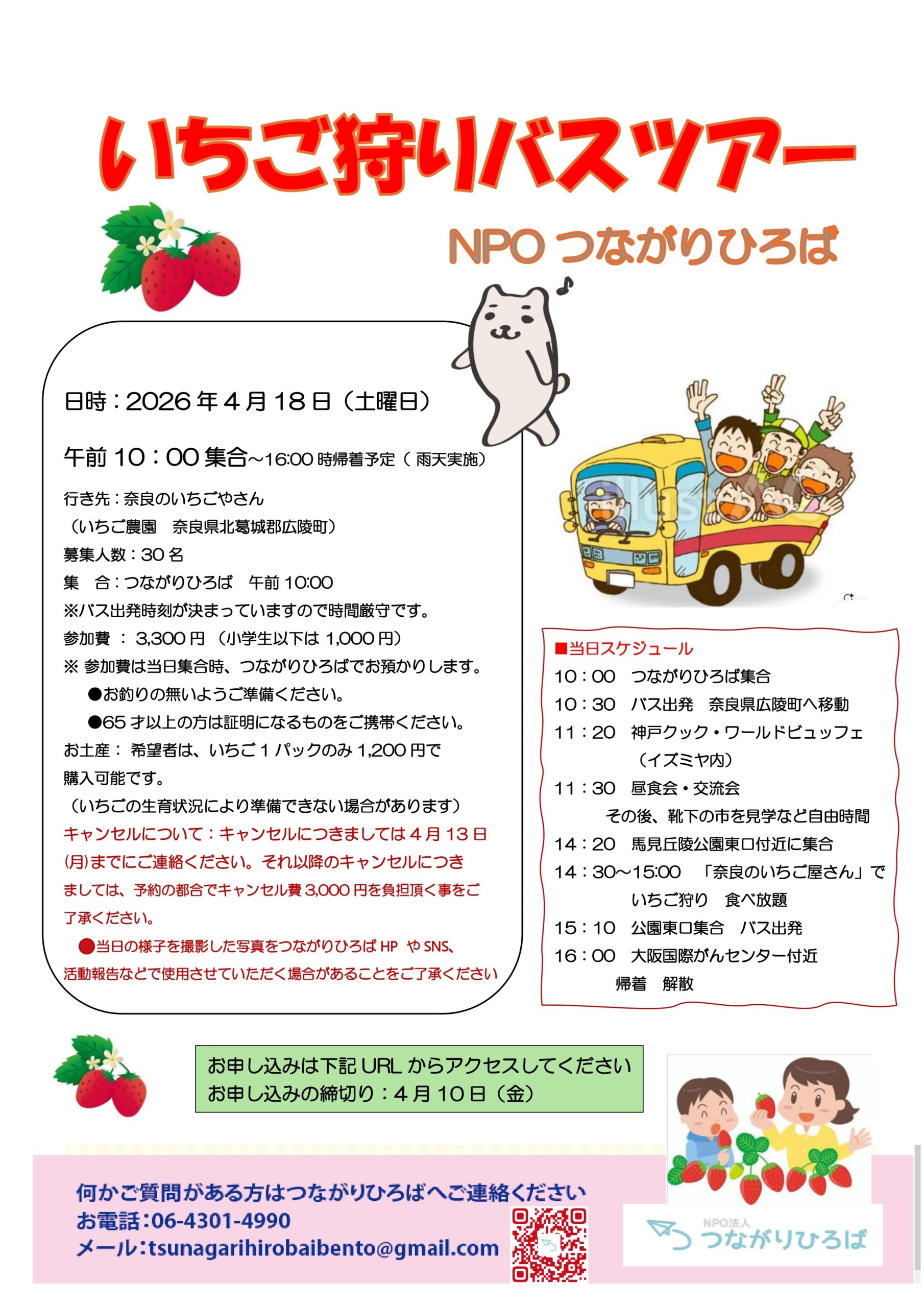 2026年3月17日 / 最終更新日 : 2026年3月17日 笹田 屋外イベント 春の遠足「いちご狩り」のお知らせ! 春の暖かさに誘われて、桜の開花も聞かれる季節になりました。 つながりひろばでは恒例の「いちご狩り」を開催します。 国際がんセンター前から奈良県広陵町へのバスツアーです。 奈良のブランド🍓「古都華」を口に入れると、幸せ気分満開です。 「奈良のいちごやさん」いつもありがとうございます! 詳細は下記のちらしをご確認ください🍓 ※当日の様子を撮影した写真を大阪府への活動報告、つながりひろばHPやSNS等で 使用させて頂く場合があることをご了承ください。 参加お申し込みは下記より お名前 (必須) メールアドレス (必須) 電話番号(必須) 参加人数1人2人3人4人5人 ※イベント当日の写真を、つながりひろばホームページなどSNSで掲載する事をご承諾いただけますか? はい、撮影は大丈夫です。いいえ、撮影はなしでお願いします メッセージ・ご質問があればお書きください Follow me!